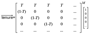 With the variables in place, it is time to look at the math used to construct the model. The distribution of tenure at month M, with a monthly turnover rate of T, was found using a Markov chain. The following matrix works on the assumption that turnover is constant and is not a function of tenure: