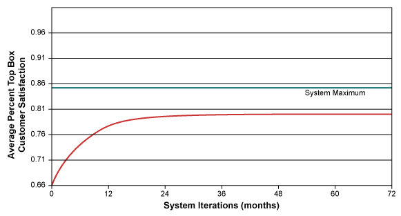 Clearly, the system improves rapidly at first. This is because the coaching effect is strongest for new agents. After about a year, however, the system stopped improving at a level well below the system maximum because the effectiveness of coaching diminishes for experienced agents and the turnover eats up the effect of improvement from coaching.